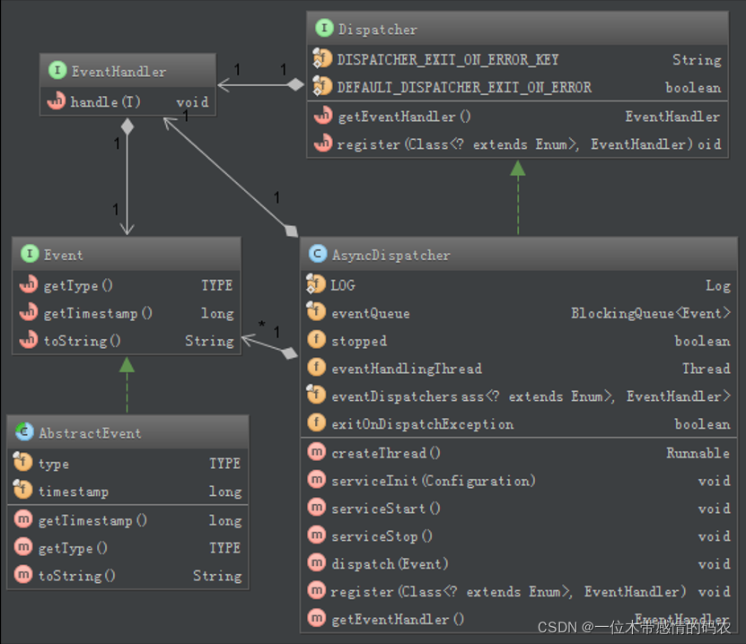 YARN 中大量采用了基于事件驱动的并发模型,该模型由事件、异步调度器和事件处理器三个模块组成。处理请求被抽象为事件,放入异步调度器的事件队列中,调度线程从事件队列中取出事件分发给不同的事件处理器,事件处理器处理事件,产生新的事件放入事件队列,如此循环,直到处理完成(完成事件)。