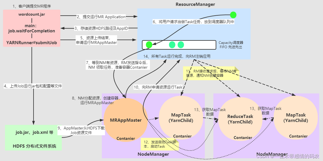 - 第 13 步:当 MapTask 任务运行完成以后,MRAppMaster 再向 ResourceManager 申请资源,在 NodeManager 中创建 ReduceTask 任务运行的容器,启动 YarnChild 进程运行 ReduceTask 任务,拉取 MapTask 处理数据,进行聚合操作;