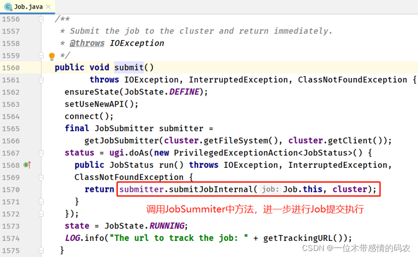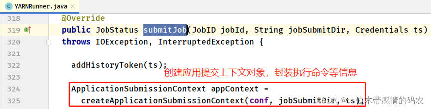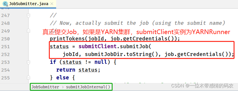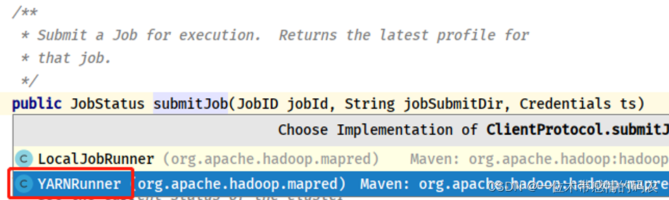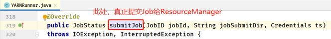 如果提交运行 YARN 集群,则最终调用YARNRunner#submitJob方法: