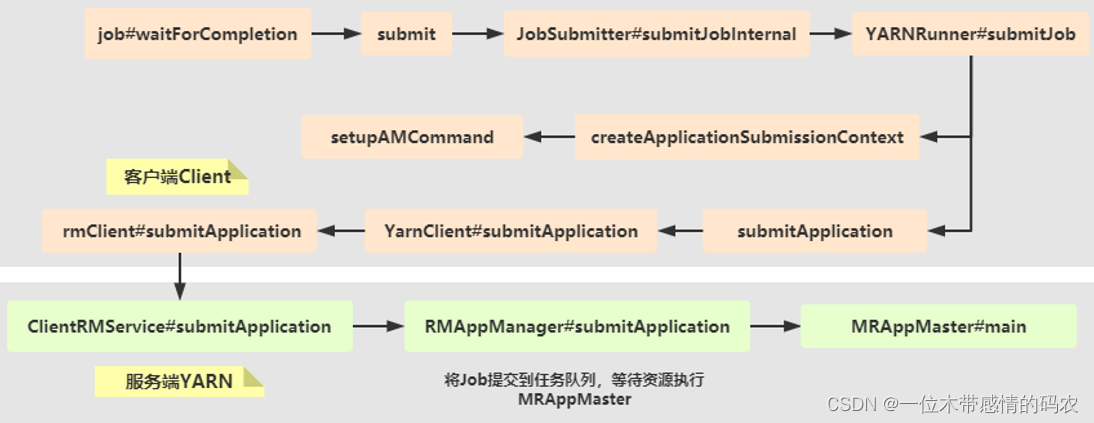 MapReduce 程序最后执行job.waitForCompletion方法时,表示应用提交执行等待完成,提交应用时,方法调用链如下所示: