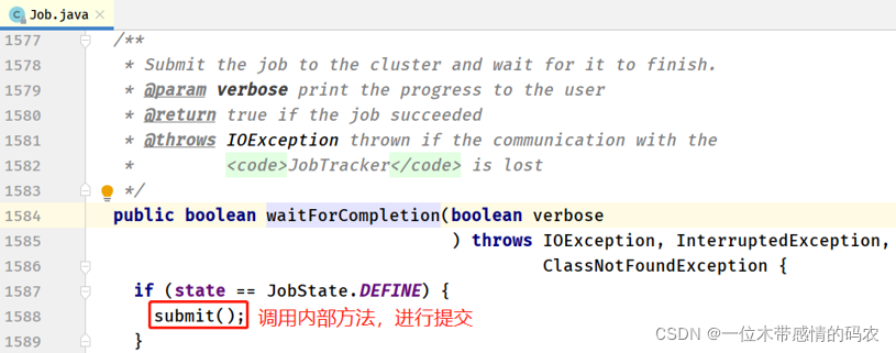 waitForCompletion -> submit -> submitter.submitJobInternal -> submitJob