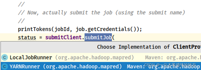 submitClient为ClientProtocol实例对象,有 2 个实现子类:本地模式运行和 YARN 集群运行: