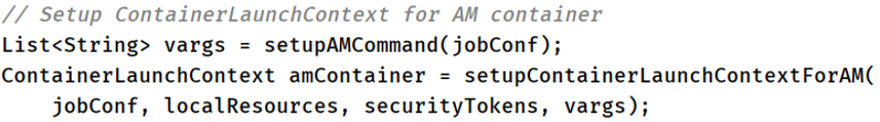 - 设置容器启动上下文:启动 AppMaster 进程 java 命令和运行日志存储等