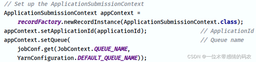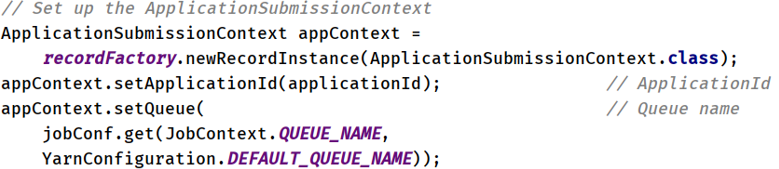 - 应用提交上下文设置:比如设置应用 ID 和运行队列 Queueu 等