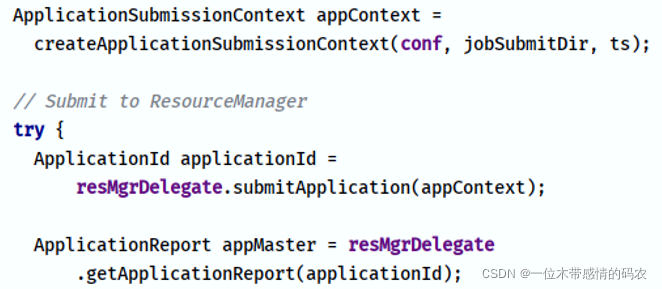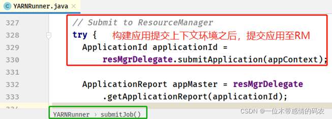 在YARNRunner#submitJob方法中,应用提交上下文构建完成后,进行应用提交。