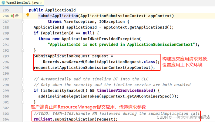 ApplicationClientProtocolPBServiceImpl类对象由ClientRMService构建,属于 RM 端的服务类,专门用于服务 Client,包括 Client 的作业提交,作业查询等服务。 - ClientRMService#submitApplication 方法