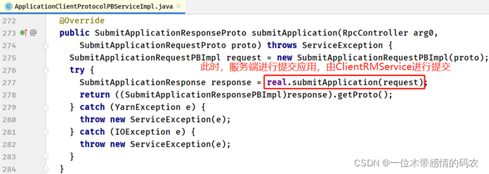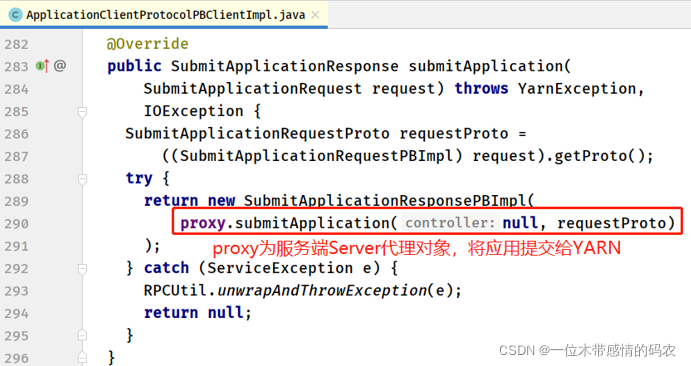 RPC Client端proxy.submitApplication()对应的 RPC Server 端的方法数为:ApplicationClientProtocolPBServiceImpl#submitApplication(),是对称的关系,都实现了ApplicationClientProtocalPB接口。 - 服务端 ApplicationClientProtocolPBServiceImpl#submitApplication 方法