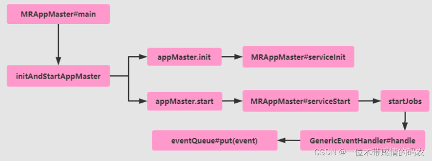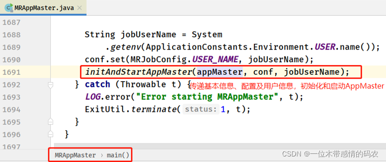 从 MRAppMaster 类中 main 查看,启动 MRAppMaster 进程流程步骤。