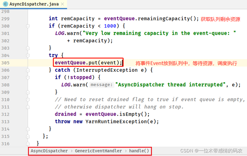 从分发器Dispatcher(实例为AysncDispatcher异步分发器) 中获取事件处理器 EventHandler,处理器的实例对象GenericEventHandler(通用事件处理器),调用handle方法启动 Job 作业执行。 - GenericEventHandler#handle 方法