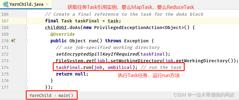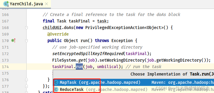 Task 类 2 个实现子类:MapTask 和 ReduceTask,查看其中 run 方法,如何执行任务。