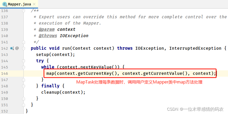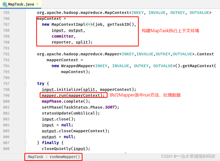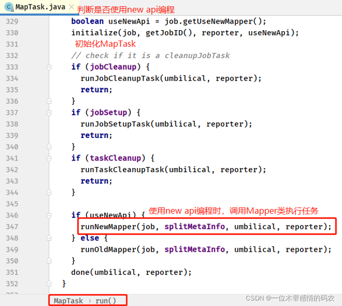 查看 MapTask 任务中 run 方法,主要判断是否是 MapReduce New API 编写程序,如果是的话直接调用:runNewMapper方法,运行 MapTask 任务。