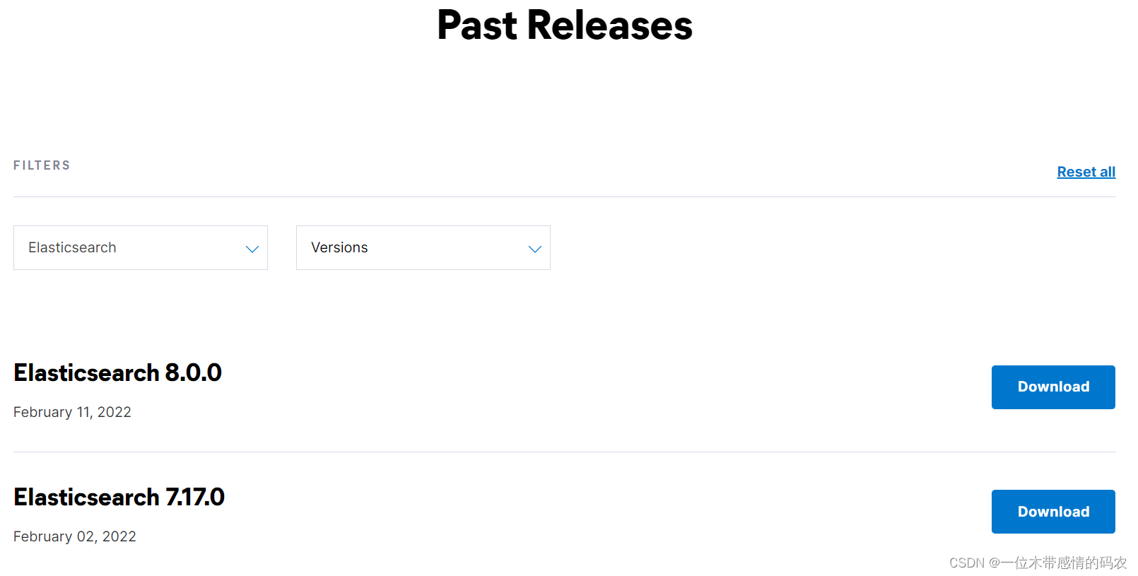 Elasticsearch 目前最新的版本是 8.0.0,我们选择 7.17.0 版本(最好不要选最新的版本)