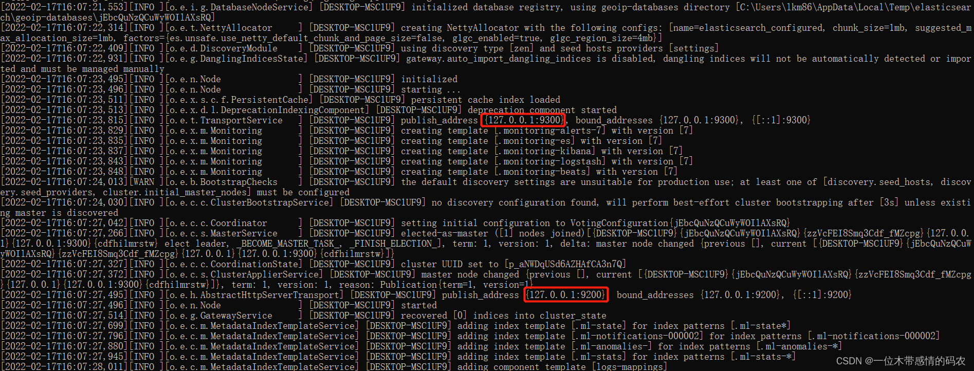 注意:9300端口为 Elasticsearch 集群间组件的通信端口,9200端口为浏览器访问的 http 协议 RESTful 端口。