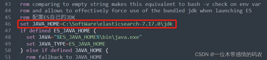 如果本地 JDK 版本不够高,可以手动指定使用自带高版本 JDK,在bin目录下找到elasticsearch-env.bat并打开,加入我们 ES 本身自带的 jdk 路径: