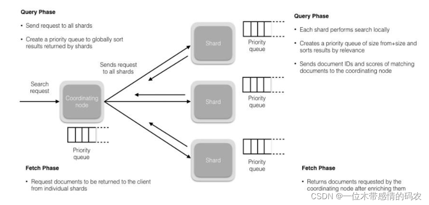 - 每个分片返回各自优先队列中所有文档的 ID 和排序值给协调节点,它合并这些值到自己的优先队列中来产生一个全局排序后的结果列表;