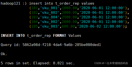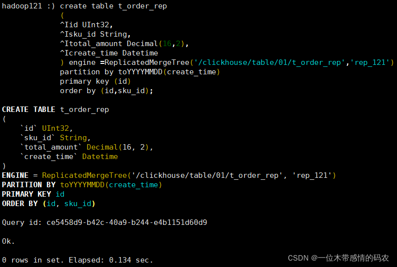 ) engine =ReplicatedMergeTree('/clickhouse/table/01/t_order_rep','rep_121')