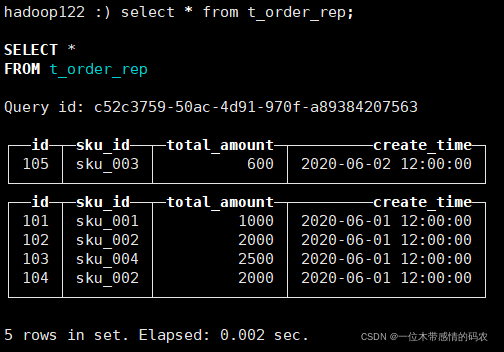 在 hadoop122 上执行 select,可以查询出结果,说明副本配置正确: