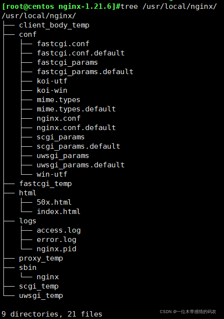 在使用 Nginx 之前,我们先对安装好的 Nginx 目录文件进行一个分析,在这块给大家介绍一个工具 tree,通过 tree 我们可以很方面的去查看 centos 系统上的文件目录结构,当然,如果想使用 tree 工具,就得先通过yum install -y tree来进行安装,安装成功后,可以通过执行tree /usr/local/nginx(tree 后面跟的是 Nginx 的安装目录),获取的结果如下: