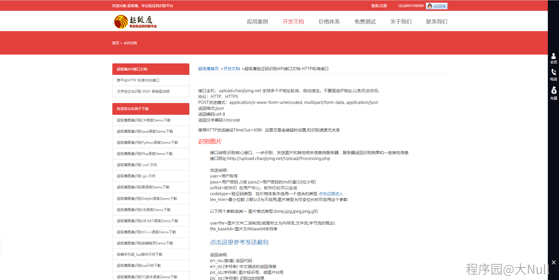 观察上面的案例可以发现,在登录过程中,有一个图片验证码需要输入,我们这里是将图片保存到本地,手动输入图片的验证码接着再登录。其实在实际的企业开发中,这一步也是需要我们自动化去完成的,一般都是结合一些第三方打码平台(一般都是收费的)来调用接口,自动输入验证码。比如超级鹰(https://www.chaojiying.com/),这里会有自己的开发文档,里面有各个语言的 Demo,这个我就不详细说了,官网都是傻瓜式教程。