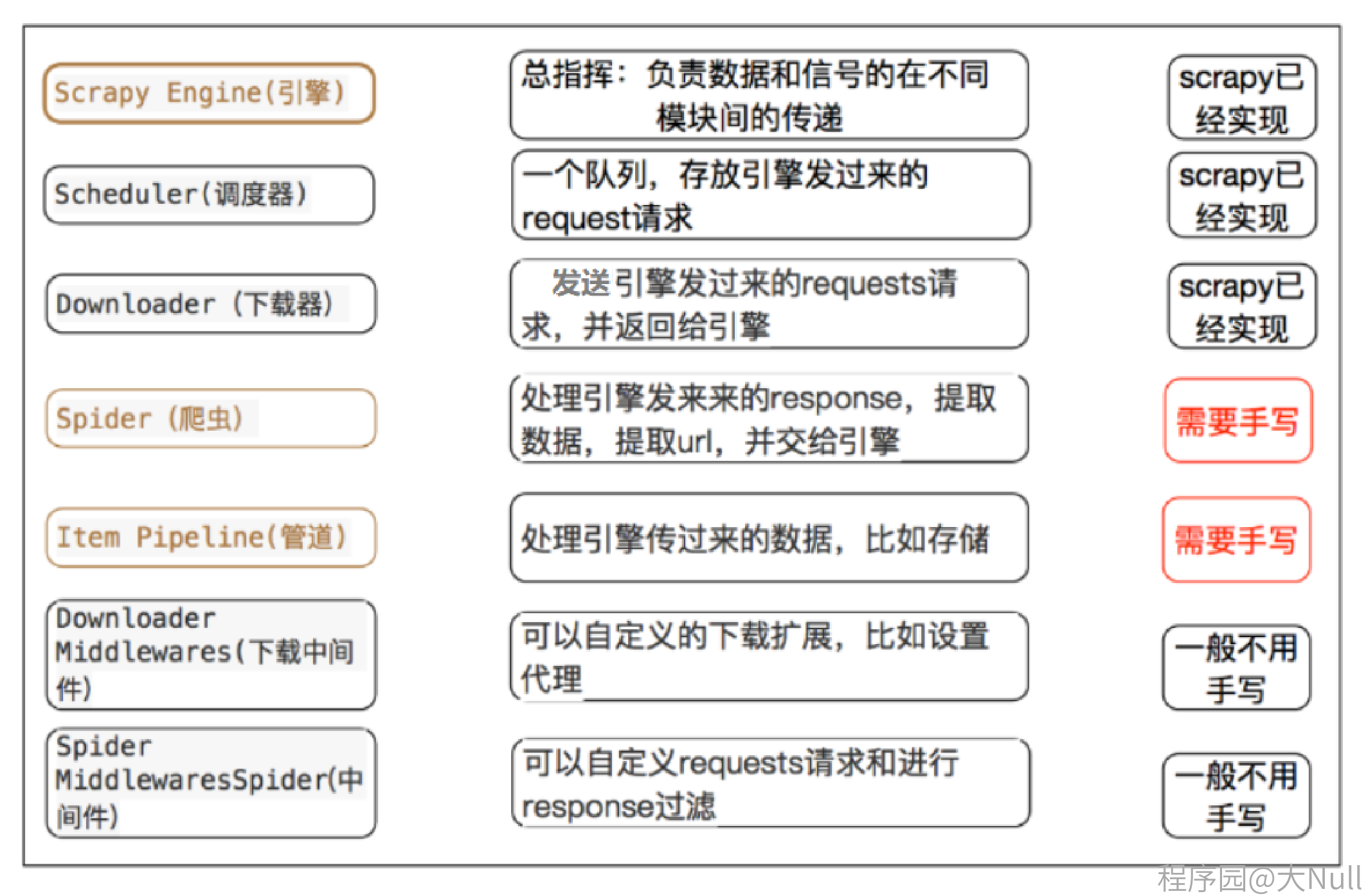 - Engine(引擎): 处理整个系统的数据流处理、触发事务,是整个框架的核心、调度中心,相当于爬虫的 “大脑”。