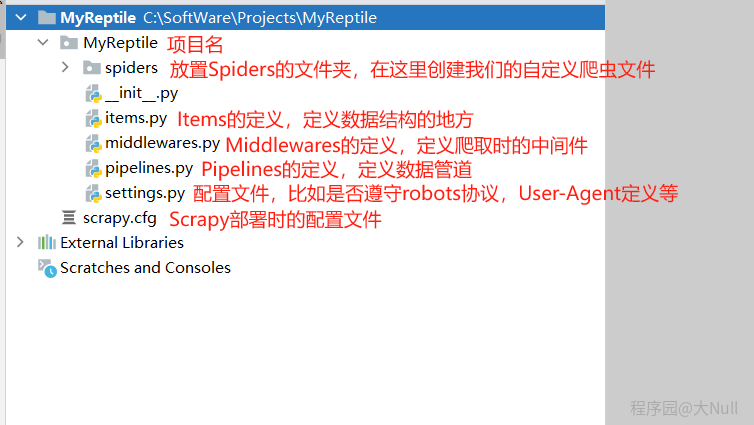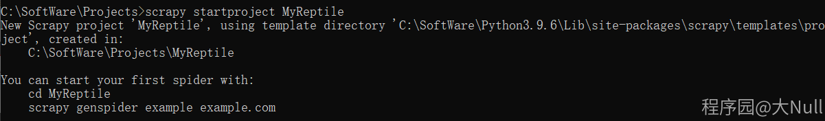 进入待创建项目所在的文件夹下,执行scrapy startproject MyReptile命令创建项目,MyReptile是项目名称。