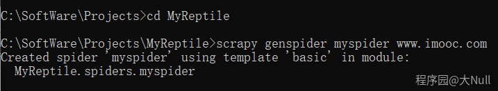 进入刚刚创建的文件夹,执行命令scrapy genspider myspider www.imooc.com创建一个 Spider,myspider是 Spider 名称,www.imooc.com是网站域名。